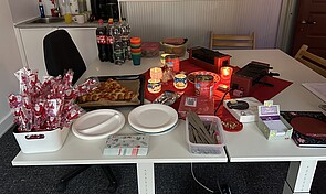 Nach der Weinverkostung wurde dann feierlich das Buffet eröffnet. Neben Raclette mit vielen Zutaten gab es noch viele weitere Leckereien wie einen Pizza-Tannenbaum, Kartoffelsalat, Würstchen und natürlich Nachspeisen wie Kalter Hund und original griechisches Melomakarona. Für jeden war auch ein kleines Geschenk vorbereitet. Natürlich lief das Live-Programm währenddessen weiter.