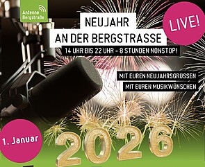 Natürlich gehen unsere Live-Sendungen auch 2026 weiter und gleich am 1. Januar gibt es einen Kracher: Unsere Live Show "Neujahr an der Bergstraße": Von 14.00 Uhr bis 22.00 Uhr geht es um Silvester, Neujahr, Neujahrsbräuche, dazu natürlich viel Musik. Die Moderatoren Timo Karcher und David Simon freuen sich auf Gäste und ganz besonders auf Euch!